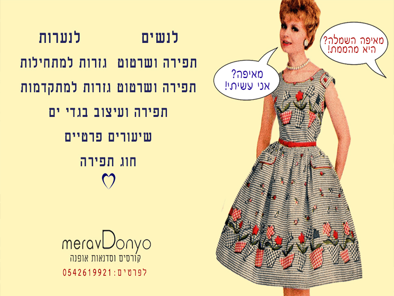 סטודיו לעיצוב אופנה בחיפה, אנו עוסקים באופנה וגם מלמדים אותה :) במקום אנו מעבירים קורסים בנושא:  קורס תפירה ותדמיתנות למתחילות קורס תפירה ותדמיתנות מתקדמות קורס בגדי ים  קורס תפירה לנערות שיעורים פרטיים וחוגים שבועיים בנושא תפירה ועיצוב  הקורסים מועברים בהנחיית מירב דוניו בוגרת אוניברסיטת ISIA פירנצה איטליה, מעצב ויוצרת כבר כעשור