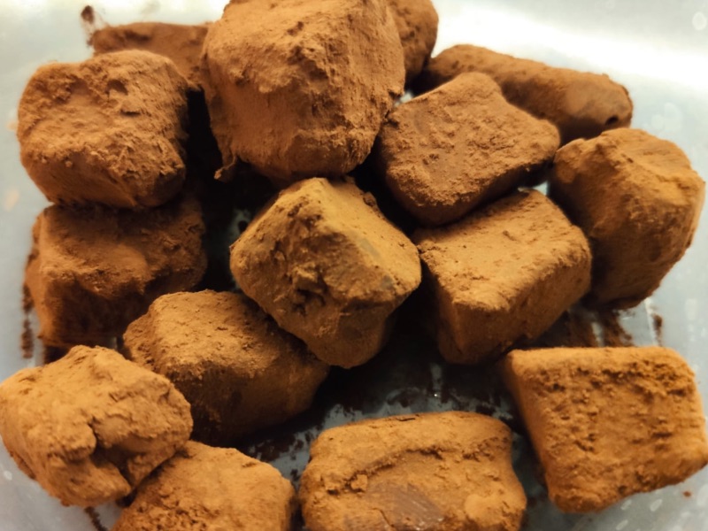 מתיכים שוקולד יחד עם שמנת מתוקה עד להמסה, מקררים ומגלגלים באבקת קקאו.